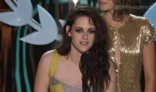 Kristen Stewart and Taylor Lautner were surrounded by some of the supporting cast of The Twilight Saga: Breaking Dawn Part 1 (but not Robert Pattinson or any of the actors who play the Cullens) on stage at the 2012 MTV Movie Awards when they accepted the Movie of the Year trophy. Stewart still hasn’t gotten used to actually delivering an acceptance speech, however, Lautner handled it well.