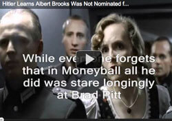I love these…sorry, but I do…and this is one of the best so far. In this twisted video, Hitler learns Albert Brooks wasn’t nominated for a Best Supporting Actor Oscar and that Jonah Hill was. And, that Moneyball‘s up for Best Picture and the Academy didn’t show Drive any love.