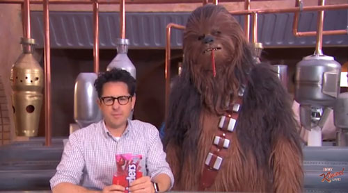 Star Wars: The Force Awakens director J.J. Abrams made out with Chewbecca, but there was a very good reason behind their lip-lock. Jimmy Kimmel challenged the director and his furry Wookie star to participate in the Twizzler Challenge in support of Autism Awareness Month.