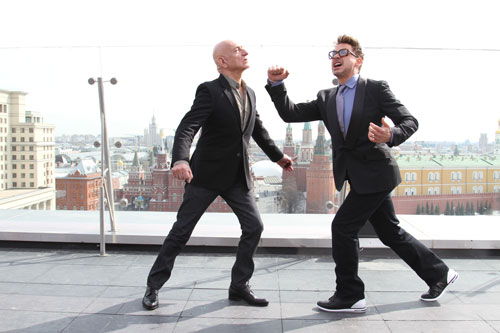 Robert Downey Jr and Sir Ben Kingsley made a trip to Moscow to promote the upcoming May 3, 2013 release of Marvel’s Iron Man 3 directed by Shane Black. The two actors who play adversaries on-screen even went as far as to throw fake punches for photographers.