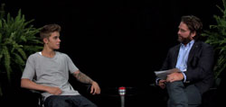 Zach Galifianakis’ latest edition of Between Two Ferns kicks off with him welcoming Justin Bieber to the talk show, saying, “It’s really exciting to talk to you, especially right in the middle of your public meltdown.” Zach then admits he’s never interviewed a seven year old before asking Bieber, “When you’re in the recording studio do you ever think, ‘Hey, what if I don’t make something sh*tty?'”
