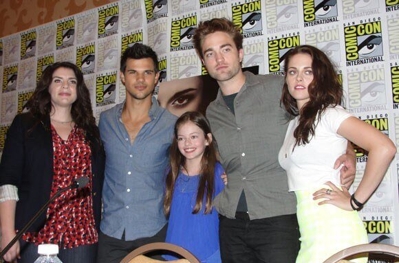 Before the big cheating scandal news broke, Kristen Stewart, Robert Pattinson, Taylor Lautner, Mackenzie Foy, and Twilight author Stephenie Meyer took part in a press conference at Comic Con to kick off the PR campaign for the final film of the series, The Twilight Saga: Breaking Dawn Part 2.