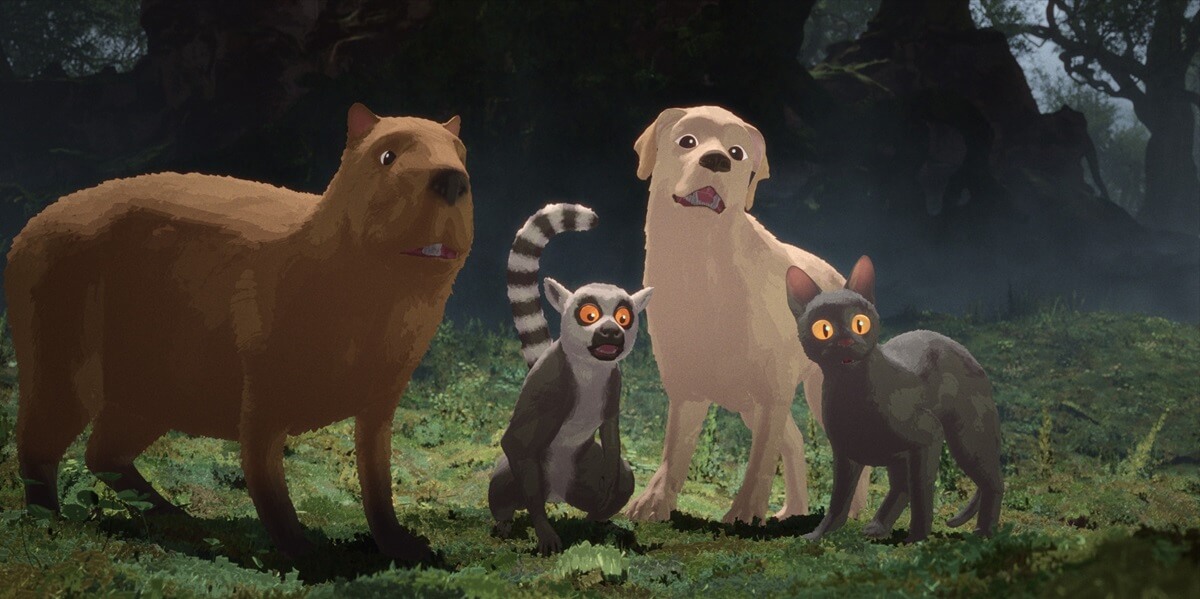 Aboard the boat is a mellow capybara who seems to recognize that the boat will keep them safe from the flood. While floating along, they pick up a lemur, determined to collect as many objects as it can. The cute and lovable dog, who tried to make friends with Cat, and a large injured-yet-proud bird, who learns to steer the boat with its working rudder, also seek shelter on the abandoned boat.