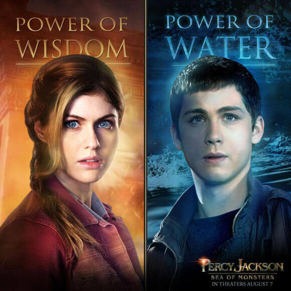 Logan Lerman (‘Percy Jackson’) and Alexandra Daddario (‘Annabeth Chase’) are pictured on this just-released character banner from the 20th Century Fox action movie Percy Jackson: Sea of Monsters. The sequel to 2010’s Percy Jackson & the Olympians reunites Lerman and Daddario with Brandon T Jackson and Jake Abel, and was directed by Thor Freudenthal (Hotel for Dogs, Diary of a Wimpy Kid).