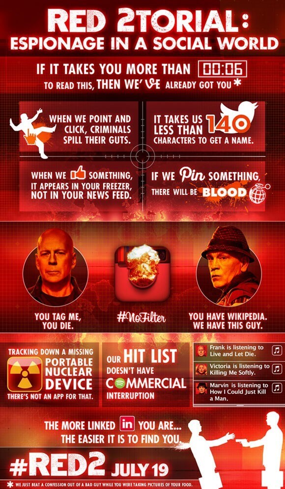 Bruce Willis returns to lead the pack of highly-skilled retired CIA agents in RED 2 heading to theaters on July 19, 2013. And in support of the film’s theatrical release, Summit Entertainment’s put together a RED-centric infographic showing how the RED agents interpret our social media-obsessed world.