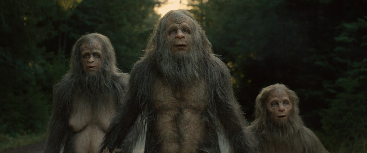 At least, it does to an extent. There’s no overdubbed narration like that which would be found on Nat Geo. In fact, there is no dialogue at all – the bigfoots (Bigfeet?) communicate with grunts and hoots, sort of like gorillas. Speaking of the sasquatches, two are played by A-listers Jesse Eisenberg (The Social Network) and Riley Keough (Mad Max: Fury Road), with Christophe Zajac-Denek (Twin Peaks) and director Nathan Zellner portraying the other two. Not that anyone can tell, as everyone is in heavy sasquatch makeup. That’s a lot of talent to be hiding, especially without any spoken lines, but it really shows what the actors can do with basically just their eyes showing and their bodies moving.