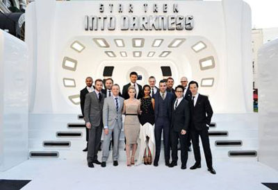 The cast of Star Trek Into Darkness – Chris Pine, Zachary Quinto, Simon Pegg, Zoe Saldana, and Karl Urban – joined director J.J. Abrams for the film’s premiere in Leicester Square, London on May 2, 2013. Hitting the lengthy white carpet surrounded by Star Trek fans, the Star Trek Into Darkness gang briefly chatted up the movie in between signing autographs and posing for photos.