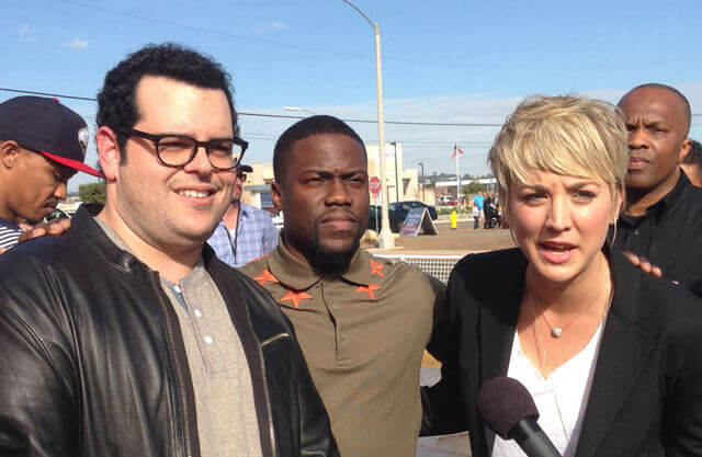 Kevin Hart, Josh Gad, and Kaley Cuoco-Sweeting, the stars of the R-rated comedy The Wedding Ringer, have been traveling the country promoting the film which is heading to theaters on January 16, 2015. The threesome obviously enjoy each other’s company, with it taking very little prompting to get them to discuss the Screen Gems release directed by Jeremy Garelick. Their final stop on the publicity tour was a visit to the Marine Corps Air Station Miramar where Hart, Gad, and Cuoco-Sweeting teamed up to talk/joke about their movie that’s actually more of a bromance than a romantic comedy. But they also took a moment at MCAS Miramar to get serious as they gave shout-outs in support of the troops.