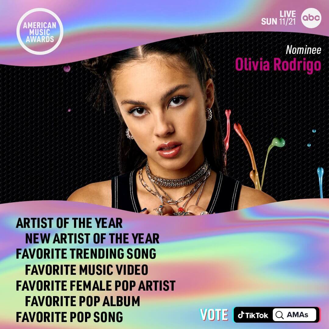 This year’s awards show will air live on Sunday, November 21st beginning at 8pm ET on ABC. (Tape-delayed on the West Coast.) Fans can now vote for their favorites to win by searching TikTok for “AMAs.”