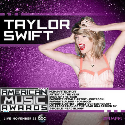 Taylor Swift tops the list of nominees for the 2015 American Music Awards with six nominations followed by Ed Sheeran and The Weeknd with five. Sam Hunt, Nicki Minaj, Sam Smith, Meghan Trainor, and Walk the Moon picked up three nominations, with Jason Aldean, Chris Brown, Luke Bryan, Drake, Fetty Wap, Florida Georgia Line, Ariana Grande, Maroon 5, Bruno Mars, One Direction, Charlie Puth, Rihanna, Mark Ronson and Wiz Khalifa each earning two.
