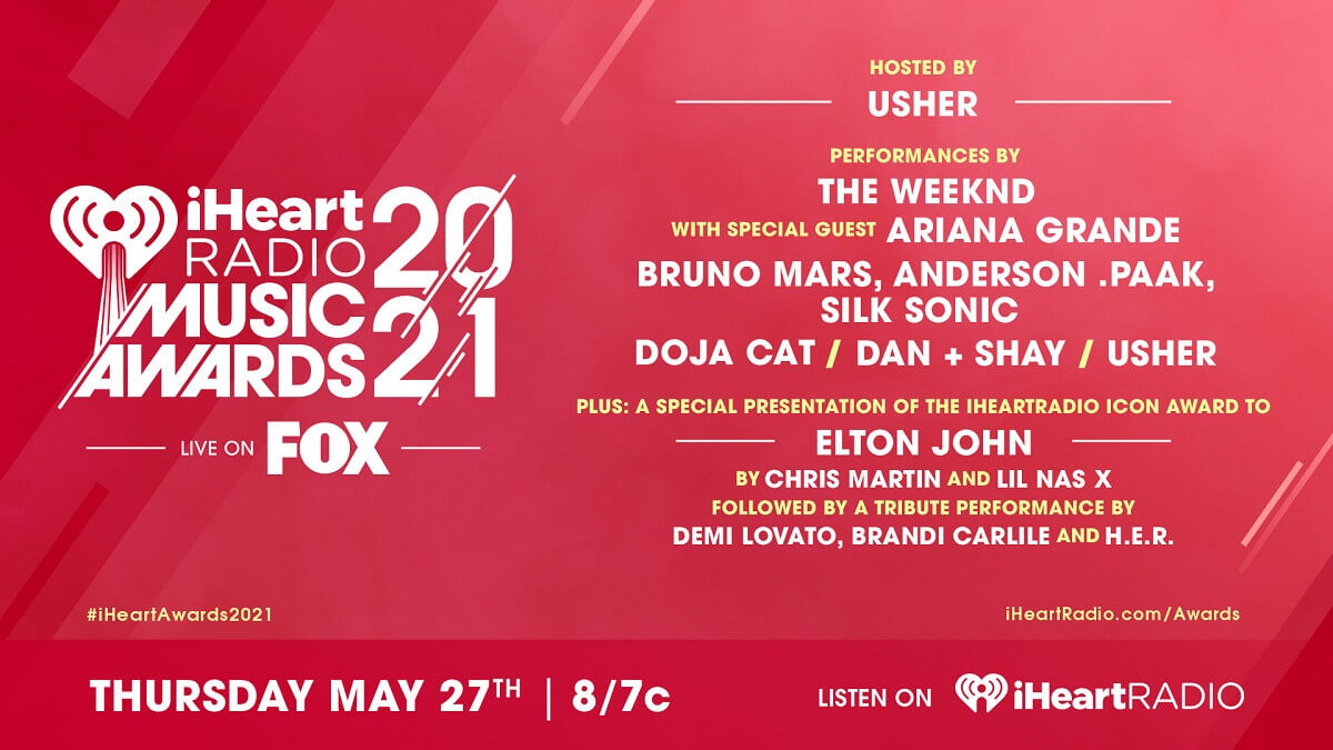 Additional performers confirmed for this week’s iHeartRadio Music Awards include the show’s host, Usher, along with The Weeknd (with special guest Ariana Grande,) Bruno Mars & Anderson .Paak (Silk Sonic), Dan + Shay, and Doja Cat.