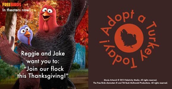 Free Birds‘ Reggie and Jake (voiced by Owen Wilson and Woody Harrelson) have been named the spokesturkeys for Farm Sanctuary’s 2013 Adopt a Turkey Project. The annual event helps to raise funds for the non-profit organization which is the largest farm animal rescue and protection organization in the US.
