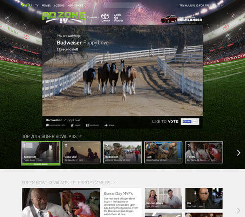 Hulu AdZone, sponsored by Toyota, featured the Super Bowl commercials as well as real-time viewing of the commercials that ran during this year’s big game between the Seattle Seahawks and the Denver Broncos.