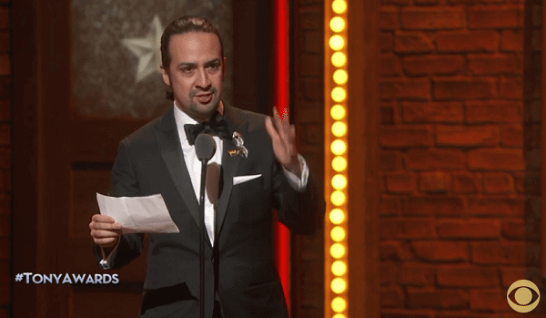 As expected, it was a night filled with Hamilton wins. The critically acclaimed musical earned 11 Tony Awards including Best Musical and Choreography, leaving it just one short of tying The Producers‘ 12 wins. Accepting the Tony Award for Best Score, Lin-Manuel Miranda said instead of freestyling he wrote a sonnet which began with a tribute to his beautiful wife. Then, getting more emotional, he said, “When senseless acts of tragedy remind us that nothing here is promised, not one day, this show is proof that history remembers. We live through times when hate and fear seem stronger. We rise and fall and light from dying embers, remembrances that hope and love last longer. And love is love is love is love is love is love is love is love is…cannot be killed or swept aside.”