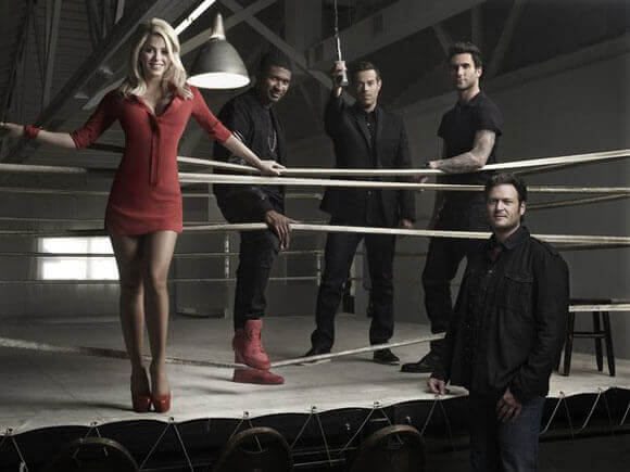 The fifth season of The Voice with judges Shelton, Levine, Christina Aguilera, and Ceelo Green has been averaging 14.7 million viewers and is the #1 show on broadcast networks on Mondays and Tuesdays (among 18-49 year olds).