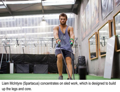 “Meticulous choreographing is necessary to ensure the safety of the actors performing the stunts,” stated stunt coordinator Allan Poppleton, the man in charge of the Spartacus boot camps. “For four weeks, we work the cast to the point of exhaustion, combining cross training elements- everything from cardio, basic gymnastics, foot and movement work, unarmed combat, body awareness, reactions, weaponry, and functional cross fit circuits.”