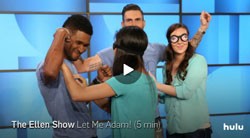 …which isn’t as strange as it sounds in the headline. Adam Levine stopped by The Ellen Show to talk about The Voice and his upcoming film Begin Again, and to take part in a test to see if two audience members could pick him out while blindfolded just by smelling/touching him. The two lucky ladies had to choose which of two men were Adam without knowing that the other man they were touching was none other than Adam’s fellow Voice coach, Usher.