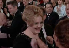 Adele is so adorable, even when she’s outside her comfort zone on stage at the Golden Globes. Accepting the award for her amazing song “Skyfall” from the Bond movie of the same name, the critically acclaimed singer did appear surprised to be actually accepting an award.
