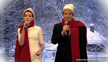 Anne Hathaway (Les Miserables) and Jimmy Fallon tackle classic Christmas songs using Mad Libs submitted by the audience in this video clip from the December 11, 2012 show. Hathaway has a much harder time keeping it together when singing lyrics that included random words that made no sense when added to Christmas carols, but Fallon wasn’t far behind in the chuckling over the bizarre new songs.