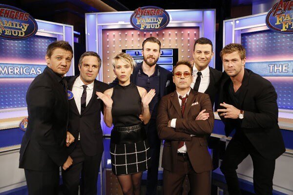 The cast of Avengers: Age of Ultron showed up to chat about the second Avengers movie on Jimmy Kimmel Live and, of course, while there they played a variety of games including Family Feud. With Jimmy Kimmel as host, The Americas (Chris Evans, Mark Ruffalo, and Jeremy Renner) took on The Mans (Robert Downey Jr, Scarlett Johansson, and Chris Hemsworth) in a very competitive game that had the teams guessing the worst place for Hulk to transform and the most common activities in movie theaters (other than actually watching a movie).