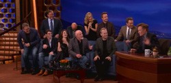 Conan O’Brien dedicated the September 23, 2013 episode of Conan to all things Breaking Bad, gathering the cast together on stage to talk about the Emmy-winning series which is coming to an end on September 29th at 9pm on AMC. Bryan Cranston, Aaron Paul, Anna Gunn (with her Emmy), Dean Norris, Betsy Brandt, RJ Mitte, Bob Odenkirk, Jonathan Banks, and Vince Gilligan all showed up to not give away anything about the finale of the series, despite Conan’s attempts to get them to reveal a spoiler or two.