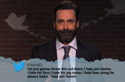 It’s time again for another edition of Celebrities Read Mean Tweets, courtesy of Jimmy Kimmel. Kimmel asked some of his recent guest stars – including cast members from The Monuments Men – to read the horrible things said about them on Twitter. Included in this edition’s batch of celebrities are George Clooney, Cate Blanchett, John Goodman, Bill Murray, Bob Balaban, Jon Hamm, Jennifer Garner, Sarah Silverman, Tom Hanks, Tim Robbins, Rob Lowe, and Benedict Cumberbatch.