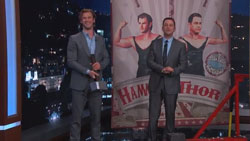Even one-handed Chris Hemsworth was able to take down Hollywood Blvd’s Spider-Man and Captain America in an epic strongman battle on Jimmy Kimmel Live. Hemsworth had a hurt hand but he was still game for an old-fashioned strongman competition.