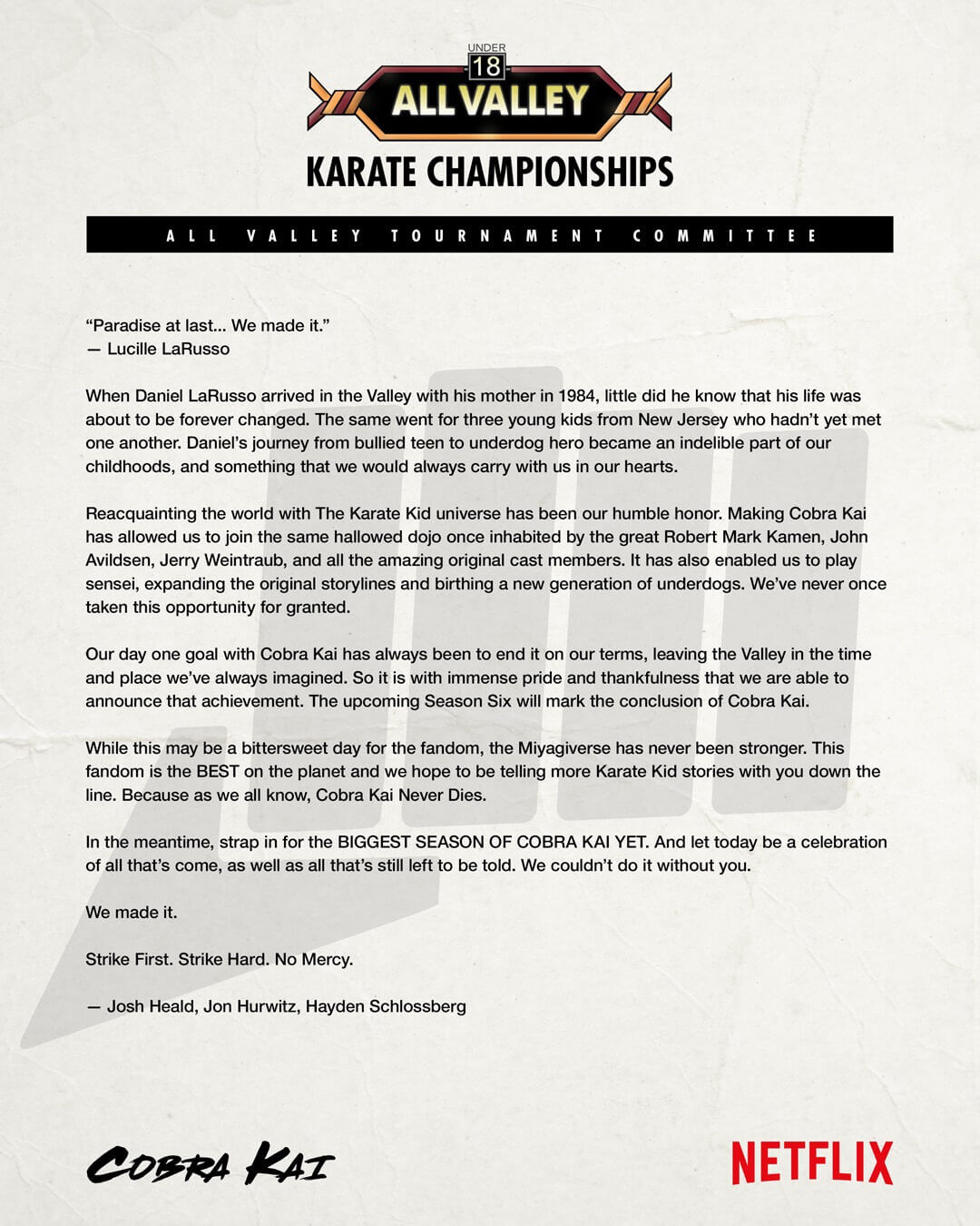 Heald, Hurwitz, and Schlossberg composed a letter sharing their thoughts on the series, the fans, and the final season. They’ve always wanted to end the series on their own terms, and with the announcement of a sixth season, they’ll be able to bring the series to a fitting end. The letter also teased that there’s reason to hope for more Karate Kid stories in the future.
