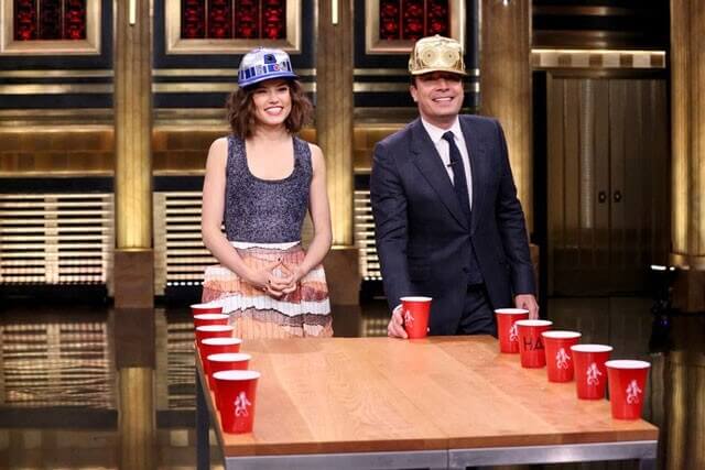 Star Wars: The Force Awakens star Daisy Ridley showed up to chat with The Tonight Show host Jimmy Fallon and, of course, she was talked into competing against Fallon in one of his games. Ridley battled it out with Fallon in a fierce game of Star Wars-themed flip cups with the object being to drink the content of a cup, flip it on its rim, and then move on to the next cup.