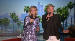 Ellen DeGeneres and Kristen Wiig admitted they don’t know the words to Frozen‘s “Let It Go,” yet that didn’t stop them from attempting a duet of the popular tune. Reading the words and trying to keep up with the track, Ellen and Wiig pretty much butchered “Let It Go” but they redeemed themselves by singing loudly and by getting up on a table to send the song off with a big finish.