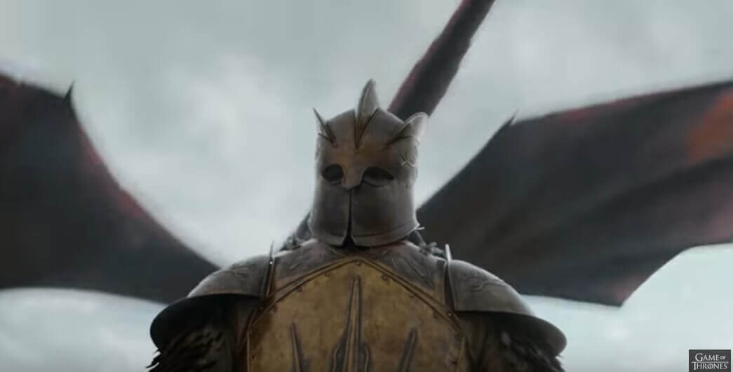 As the knight lies prone and motionless, The Mountain walks over and stands above him. He does to the knight what he did to Oberyn Martell (played by Narcos’ Pedro Pascal), although thankfully for those munching on Super Bowl snacks we don’t see the gruesome aftermath. The Mountain’s attack is interrupted by the arrival of one of Daenerys’ dragons. The TV spot ends with the arena going up in flames.