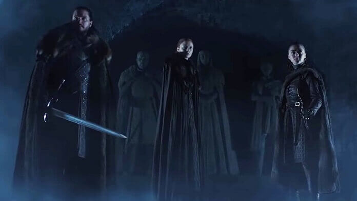 Viewers tuning in to watch the season three premiere of HBO’s True Detective were the first to see a new teaser trailer for season eight of Game of Thrones. The minute and a half teaser features Jon Snow (Kit Harington), Sansa Stark (Sophie Turner), and Arya Stark (Maisie Williams) reunited in the family’s family crypt at Winterfell. They walk the darkened corridor until it ends and they come face-to-face with statues of themselves.