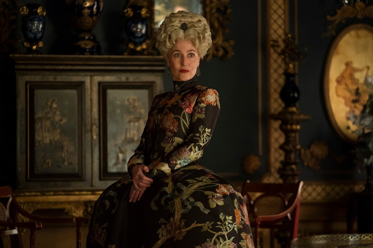 Hulu’s just released the first photos of Gillian Anderson as Joanna, Catherine’s mother, in the much-anticipated second season of the critically acclaimed series, The Great. In one photo, Gillian Anderson’s pictured with her onscreen daughter, Elle Fanning. The other is a solo shot of Anderson as Joanna.