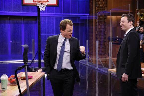 Rake star Greg Kinnear took on The Tonight Show‘s Jimmy Fallon in a shootout involving the tossing of random items into a basketball hoop. The shootout was held in honor of the NCAA Tournament, with the lineup of items tossed including a foot-long hotdog, a mannequin head that looked like Tom Cruise in Legend, a bowl of bouncy balls, a Shamrock Shake, and a rake.