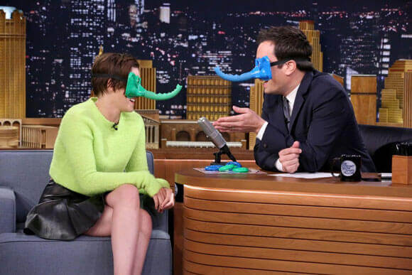 Kristen Stewart’s still uncomfortable doing interviews, and even The Tonight Show host Jimmy Fallon can’t get her to relax and loosen up. The closest he came during their interview for the dramatic film Camp X-Ray was during a game of Ring Around the Nosey. The object of the game: put on an elephant mask and using only the nose, pick up a ring off the desk. First one to accomplish the task wins.