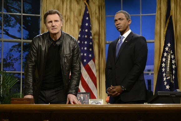 SNL brought in Liam Neeson (currently seen in theaters starring in Non-Stop aka Taken on a Plane) to kick off the March 8, 2014 episode of the late-night series hosted by Lena Dunham (Girls). Neeson, playing himself, joined Jay Pharoah playing President Obama to condemn Russia for invading Crimea.