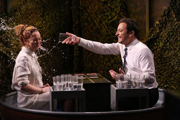 Actress Lindsay Lohan and host Jimmy Fallon play Water War on March 6, 2014 (Photo by: Lloyd Bishop/NBC)Lindsay Lohan took on The Tonight Show‘s Jimmy Fallon in an epic game of Water War in which whoever turns over a lower-valued playing card gets doused in the face with a large glass of water. And even after cheating, this Water War was a lopsided battle that found Fallon in need of a complete change of clothes.