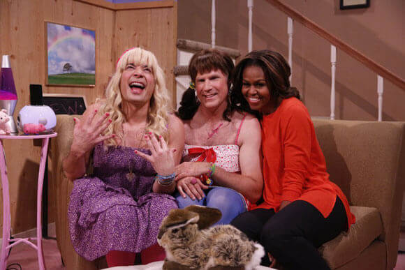 Jimmy Fallon, Will Ferrell, and Michelle Obama on 'The Tonight Show' (Photo by: Lloyd Bishop/NBC)First Lady Michelle Obama showed off her acting and “ew!” skills by joining Jimmy Fallon as Sara (no H) and Stacy (the very hairy-chested Will Ferrell) to talk about exercising and eating right. First Lady Obama was a guest on The Tonight Show Starring Jimmy Fallon on February 20, 2014 where she chatted about her charitable interests and getting young people signed up for health care.