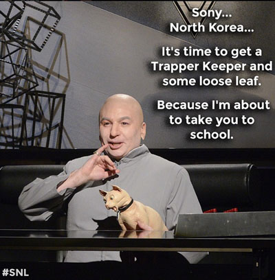 Former SNL cast member Mike Myers put in a surprise appearance on the December 20, 2014 episode of Saturday Night Live, reprising his Dr. Evil character and mocking both Sony and the North Korean hackers. Dr. Evil believes both North Korea and Sony Pictures have given villains a bad name, and that their battle over the comedy movie The Interview is like watching two bald guys fight over a comb.