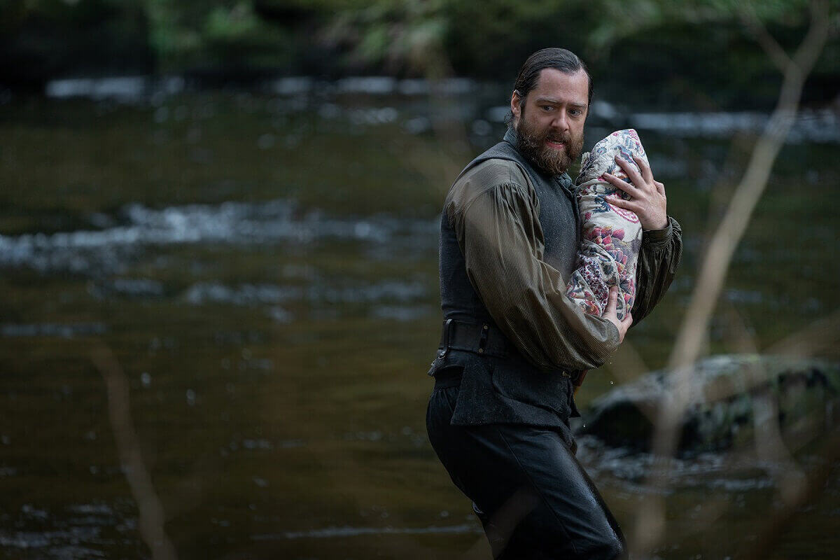 Starz’s Outlander season six episode three opens with young boys sending Henri-Christian down the river in a basket. Fortunately, Roger (Richard Rankin) hears the baby’s cries and the boys yelling from the riverbank as the basket floats down the river through the rapids and toward a waterfall.