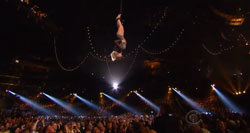 It worked so well in 2010 that Pink returned to her post soaring above the Grammys audience while she performed “Try” at the 2014 Grammy Awards. Pink’s Cirque du Soleil moves had the audience on its feet, but that wasn’t the end of her Grammy act. After landing on the stage, she fake-fought with a dancer in a beautifully choreographed show of strength. Pink then followed up “Try” by dueting with Nate Ruess from fun. on their hit single, “Just Give Me a Reason.”
