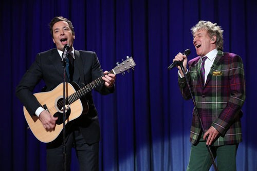 Jimmy Fallon and Rod Stewart -- (Photo by: Lloyd Bishop/NBC) Jimmy Fallon had a Rod Stewart-ish song pop into his head and had to do it with Stewart. He posted a video asking Stewart if he’d be willing to perform it with him on the show, and, fortunately, Stewart went for the idea. The twosome performed it on Late Night with Jimmy Fallon and Fallon posted it for us all to check out:
