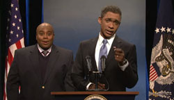 The December 14, 2013 episode of Saturday Night Live hosted by John Goodman kicked off with President Obama (Jay Pharoah) apologizing for his selfie at Nelson Mandela’s funeral and his handshake with Raul Castro, blaming the controversial actions on ‘a series of unfortunate events.’ And as the President explained what really happened, the fake sign language interpreter (Kenan Thompson) gestured behind his back.