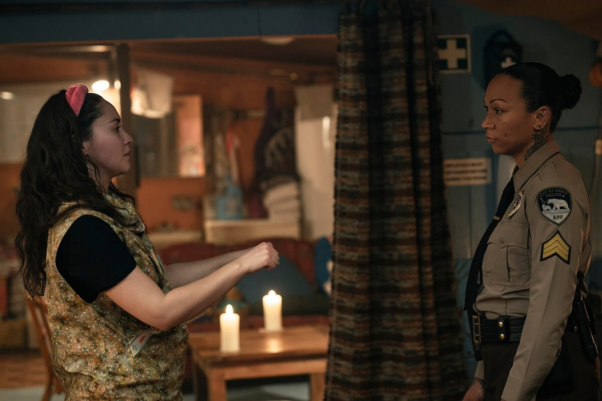 Ennis Police Officer Evangeline Navarro (Kali Reis) shows up to arrest Annie Kowtok for trespassing and destruction of the mines and is met with screaming from inside the building. The building turns out to be a birthing center, and Navarro discovers that Annie is currently busy performing midwife duties. Instead of immediately arresting Annie, Navarro finds herself helping with the delivery. The new mom-to-be realizes the baby isn’t crying and becomes hysterical. Annie works to revive the baby, and suddenly, the baby cries out.