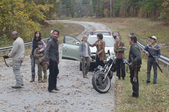While walking Carl (Chandler Riggs) back to the farm after killing Shane (Jon Bernthal) twice – first, when he was going to murder Rick and the second time when Shane rose from the ground as a zombie – Rick and Carl are shocked and horrified to see a herd of “walkers” heading straight for them and the farm. Meanwhile, Daryl (Norman Reedus), Glenn (Steven Yeun), Maggie (Lauren Cohan), Hershel (Scott Wilson), and the rest of the group back on the farm have also noticed the army of undead heading their way. Deciding the best defense is a good offense, the gang quickly formulates a plan to use the vehicles and their weapons and take the fight to the zombies before they actually get to the farmhouse.