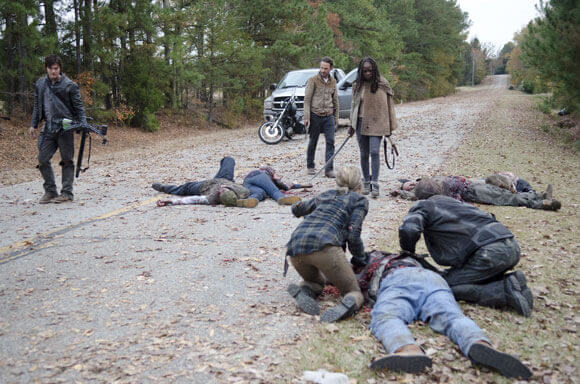 Panicked and confused, the Governor’s army runs in different directions, coming into a few hungry walkers and finding themselves being fired upon by Glenn (Steven Yeun) and Maggie (Lauren Cohan) dressed in prison riot gear. Terrified and being whittled down, the broken-down army flees the prison with the Governor and his loyal henchmen in close pursuit.