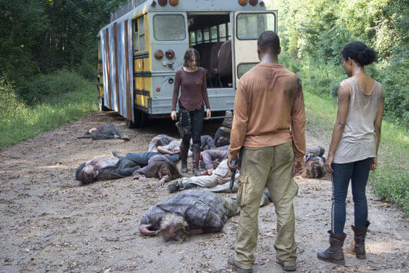 Maggie (Lauren Cohan), who escaped with Sasha (Sonequa Martin-Green) and alcoholic Bob (Lawrence Gilliard Jr.), is determined to find Glenn and traces the school bus, where she last saw him and believes he’s still possibly on board, to find to her horror it’s filled with walkers. Needing to know if Glenn is in there as either a zombie or one of their meals, Maggie, Sasha, and Bob begin to let the walkers out the back door one by one to see if Glenn appears.